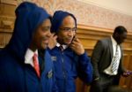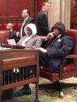 6. GA Senators Lester G. Jackson and Emanuel Jones put on hoodies as they leave the State Senate floor to join a Trayvon Martin rally outside.