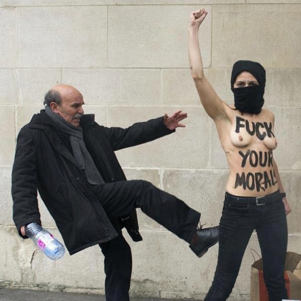 If you don’t know about Amina or the topless jihads world wide today I suggest you get googling, Amina Tyler is a 19 year old woman who posted bare breasted photos with the slogan “My Body is My Own and Not the Source of Anyone’s Honor” on her chest. She was arrested and sentenced to “100 lashes” and being “stoned to death”. She went missing and in response FEMEN activists are staging bare cheated protests. This image displays a man kicking an activist protesting outside a mosque. WAKE UP. NUDITY IS NOT A CRIME.