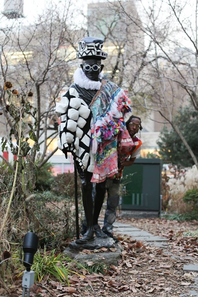 Wendell is hands down the greatest homeless fashion designer who ever lived. He makes almost all his clothes from things he finds. I hadn’t seen him in awhile, so I was quite thrilled to walk up on him Tuesday, doing this to a Gandhi statue.