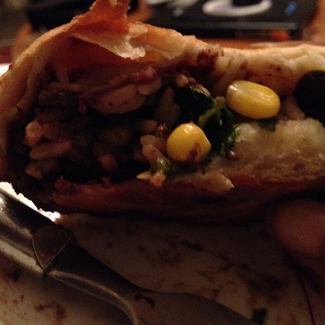 Homemade hot pocket. Made the dough a few months back. Stuffed it with black beans, wild rice, peppers, corn and spinach. Rubbed coconut oil on top.