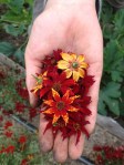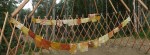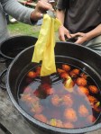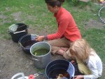 Project: We dyed the muslin with natural dyes from the garden; marigolds, coreopsis, tanzy and yarrow. Then we block-printed our original designs on the cloth and sewed them together on a string.