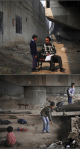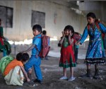 Every few minutes a train passes above, the children unperturbed by its sounds.