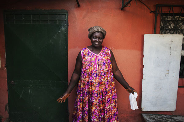 Genevieve Ndjessa gestures in front of her house in Douala, Cameroon, November 3, 2013. Genevieve’s daughter Julie Ndjessa, whose breasts were ironed by her mother when she was 16, now gives weekly education session about breast ironing and rape to girls in their family living room. New government research shows that ‘breast ironing,’ where the breasts of young girls are flattened using a hot stone, has seen a 50 percent decline since it was first accidentally uncovered during a 2005 survey by the German Technical Cooperation Agency (GTZ) on rape and incest in Cameroon. Picture taken November 3, 2013. REUTERS/Joe Penney (CAMEROON – Tags: SOCIETY HEALTH) – RTX174CH