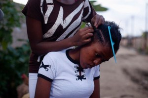 A girl braids her friend’s hair on a street after a weekly education session about breast ironing and rape by survivor of breast ironing Julie Ndjessa in Douala, Cameroon, November 3, 2013. New government research shows that ‘breast ironing,’ where the breasts of young girls are flattened using a hot stone, has seen a 50 percent decline since it was first accidentally uncovered during a 2005 survey by the German Technical Cooperation Agency (GTZ) on rape and incest in Cameroon. Picture taken November 3, 2013. REUTERS/Joe Penney (CAMEROON – Tags: SOCIETY HEALTH) – RTX174CJ