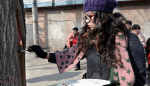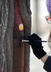 Wang Yue calls the tree-hole paintings “meitu” which means “beautiful journey.” The paintings on the trees have brightened the city during the dull, grey winter.