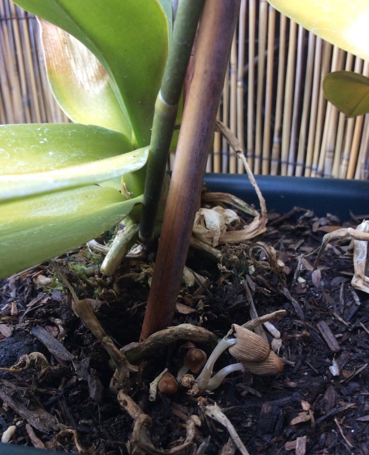 The fairies have blessed my urban garden! I found a ring of five mushrooms hiding under the orchids.