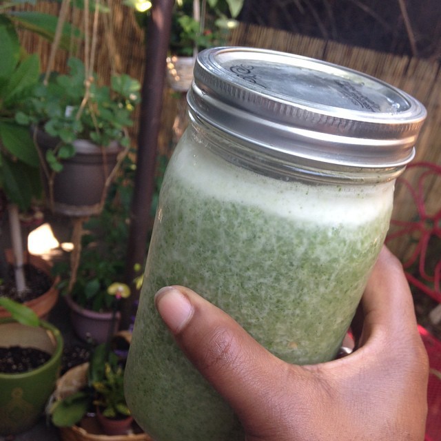 Cheers! #greensmoothie #lucuma #pineapplemint #orange #almondmilk #spinach #strawberry #banana #H20 #urbansoulfarmer #zoeblaq #cali